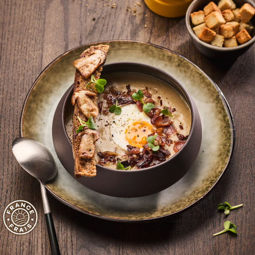 Velouté de champignon, bacon et œuf poché